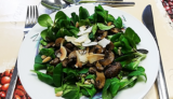 Feldsalat auf Salattellern anrichten, etwas Dressing darüber geben, mit Pilzen, gerösteten Kürbiskernen und etwas Parmesan bestreuen.